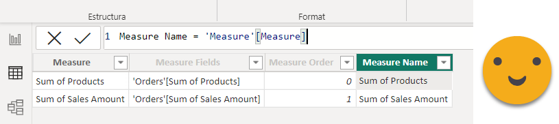 A couple things about this code. The first is that «Measure» is the field parameter, and «Measure Name» is a calculated column that takes the value from the first column of the field parameter. This way it does not complain when you use it as a regular column. If you try to use the first column you get some dax error and you need a much more convoluted dax to use it. I got this piece of wisdom from Kane Snyder on Twitter.