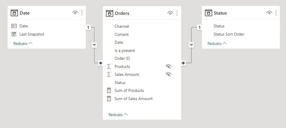 We proceed to load the table to Power BI and we create a super-simple calendar with a «Last Snapshot» calculated column, like we did in part 1 of this improvised series. When we build a matrix to show this last snapshot, we realize that the status (stati? statuses?) are not sorted correctly. To sort them properly we could add a column to the fact table, but auxiliary columns on the fact table are a big no-no. After all we want to set filters in tables other than the fact table, since this gives us most flexibility in our visualizations. So we build a small status table with the sort order. We set the correct sort order (Confirmed-Prepared-Shipped-Deliveded) and create the relationship with the fact table. While we are at it I also created the measures for the two numeric columns.