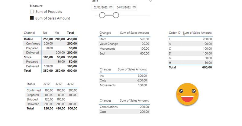 And that's it for the calc group! Notice that for outs, advances and cancellations we put the number in negative since they explain a reduction of orders in the filter context. This alone already provides a lot of joy in the report. If you notice the ordinal numbers, I've ordered calc items in a way that can show the Level 1 2 and 3 in different tables. If you put them all together it's just too hard to follow and aggregates bring value too. The thing is that leaving all the interactions is cool, but sometimes difficult to understand… let's see this with a video