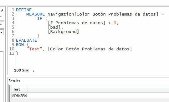 DEFINE MEASURE Navigation[Color Botón Problemas de datos] = IF ( [# Problemas de datos] > 0, [bad], [Background] ) EVALUATE ROW ( "Test", [Color Botón Problemas de datos] )