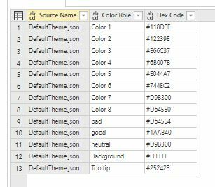 Important note, if you define your custom theme you should start with a faux custom theme like the one I described, so that power query finds all the codes it needs, not just the ones you changed. Then, you update your custom theme, export it as json file and replace the source file from which you are reading to get your color table.
