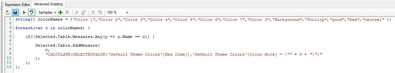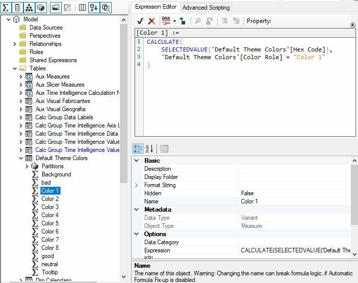 So now I had a table I could load to any Power BI, but I didn’t have my measures, yet. I wanted to be able to say [background] and get «#FFFFFF» (or rather the color defined as such in the json file). I could type each of the measures by hand, but this didn’t look very efficient (as Patrick Leblanc says, I’m not lazy, I’m just really efficent), especially as I was thinking on making it part of the corporate template Mike Carlo talked about in the interview with Reid. So I turned my attention to Tabular Editor, from which I knew you could (besides calculation groups of course!) make scripting to modify the model. It took me quite a few tries and errors, but got what wanted: creating all those measures with a single click!