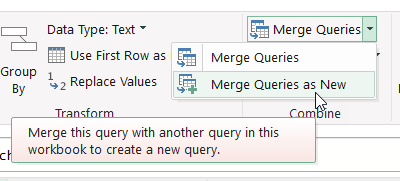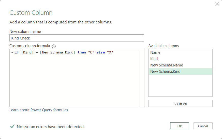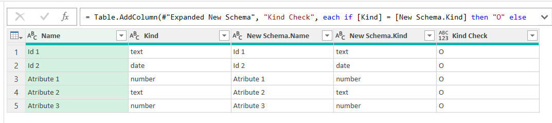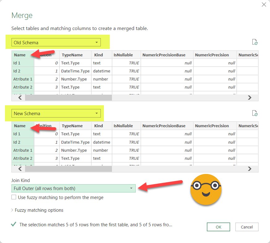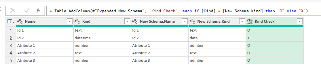 As you see we get the metadata of our queries. Field names, order, types etc. So let’s compare both — we need to make sure that fields exist with the same name in both queries and with the same type. Well, if we are using diferent sources (Analysis Services vs Excel or whatever) we might get different TypeName descriptions for things that Power Query considers the same, so we’ll consider just the «Kind» column when comparing. Select the «Old Schema» query and select Merge Queries –> Merge Queries as New
