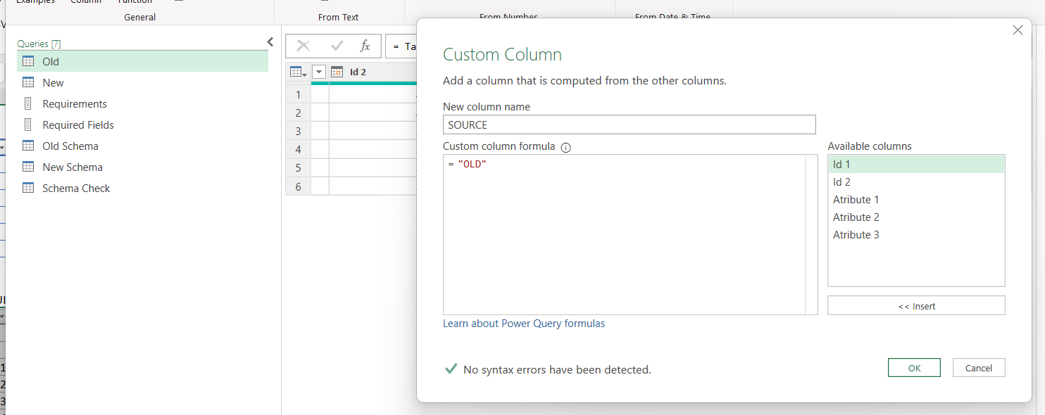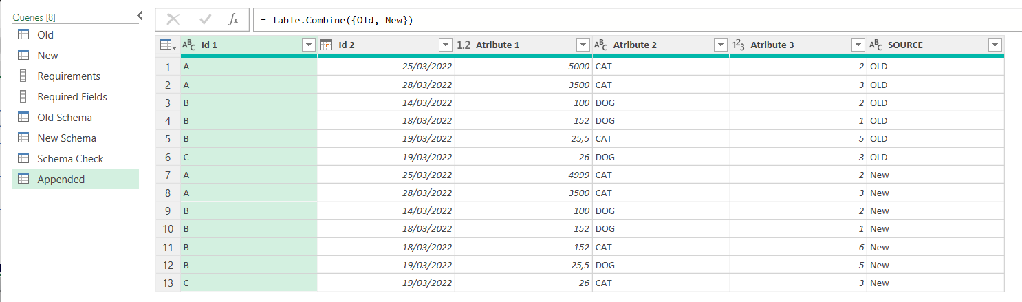 To compare the data will bring all the data together. Of course though we still need to know where the data is coming from so before the append we’ll go to the New and Old queries and add a custom column called «SOURCE» (or something similar that is not used in your table) and as value we put «OLD» for the Old query and «NEW» for the New query. Or something along these lines.