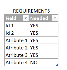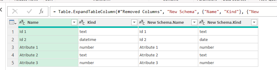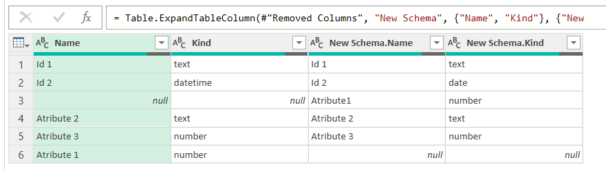 Expand the columns and leave only the ones you need. If you are working with relational databases you might want to make sure that all the small details about the data type is right. Otherwise making sure that the field exists and is the same «Kind» is enough. From our example (well I did a little thing to get things a bit more tricky) we get something like this