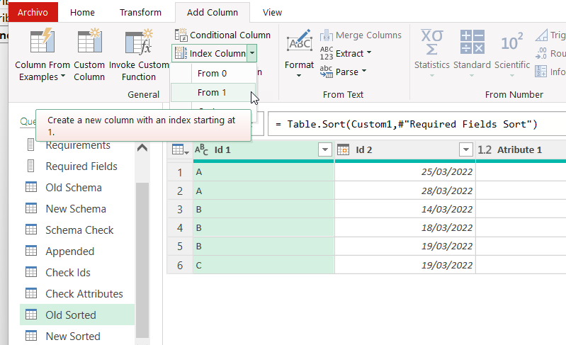 Once you do this, the index column is your primary key. So you follow the same steps we did with the Attribute value check, but select the index column and the source column, then unpivot the rest, then pivot the source column and you’ll get the value of each attribute (well of any field indeed) for row 1 row 2 row 3 etc for both old and new queries. Important to do this validation at the very end, since any row that is on one query but not the other will cause all subsequent row checks to fail. So this one is to be extra sure that all is fine. Needless to say, if you do not have a primary key you can only validate if you have the same number of rows in both tables. Anyway, once you add the validation columns it should look something like this.