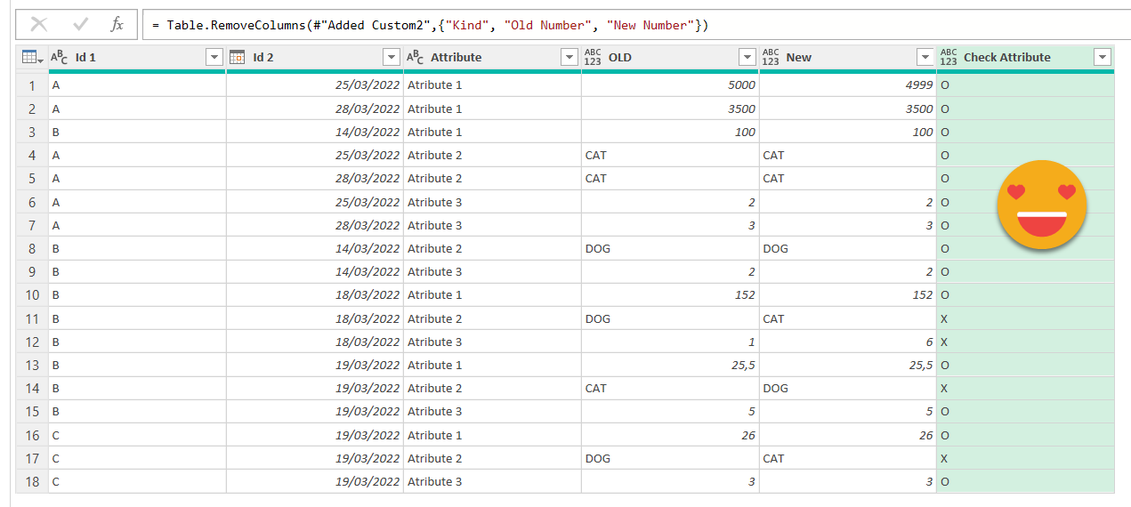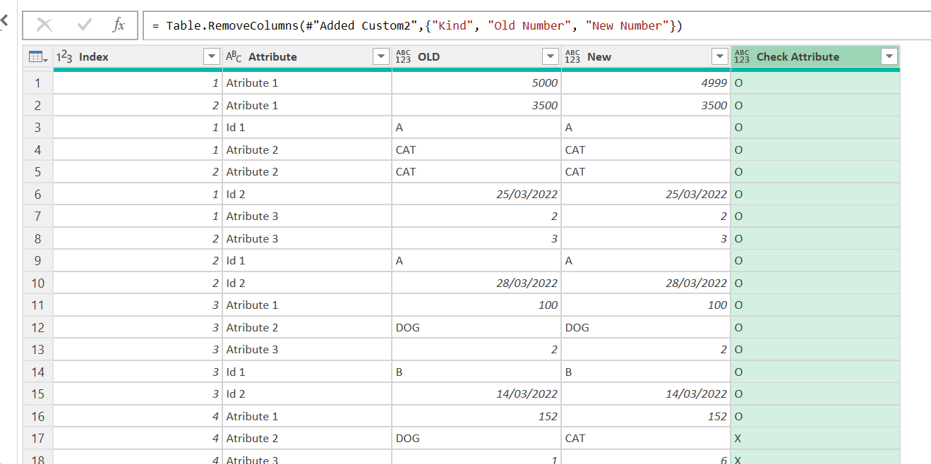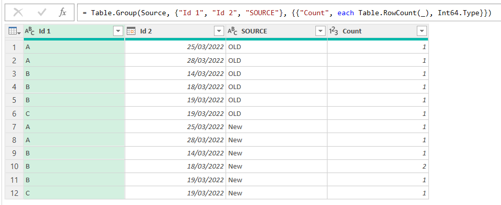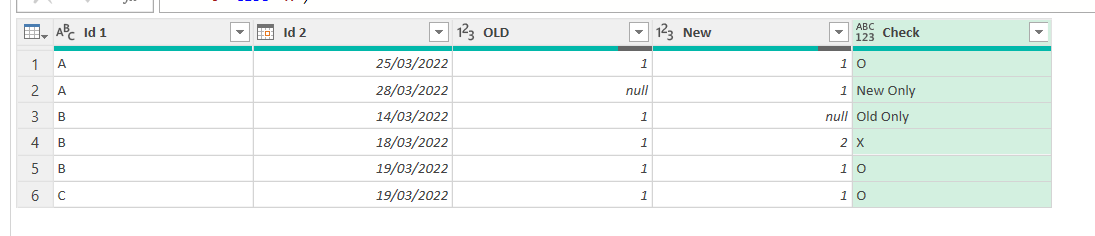 Note: since we are dealing with a tiny amount of data we can check things without leaving the power query editor. For a real life use case you’ll need to load the data into the sheet and make sure that you don’t get any X or missing id in either side. Any «Only in New» is an id that should not make it to the table, since we need to replicate whatever the old process did. But even if we somehow accept that the new table will have more rows than the old one and we just want to make sure that those that match have the same values, we need to make sure that we don’t get any value over 1 if we are supposed to have primary key by one or more fields combined.