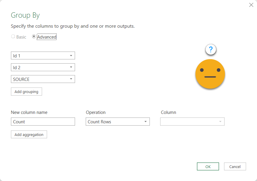In the example we’ll select ID 1, ID 2 and SOURCE. Now we go to Transform Columns tab –> Group By and leave the settings as they are, which will generate a count rows field as aggregation, which is exactly what we want to do. At this point it might not be quite clear what we want to achieve, but you’ll see it in a sec.