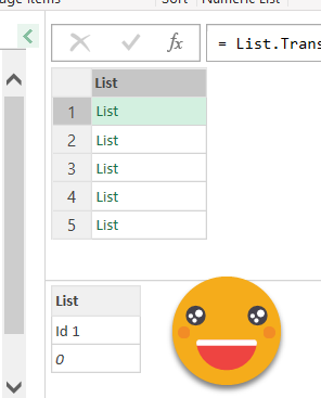 List Transform will, er, transform a list, and when we use each in the second argument we can transform each item. To refer to the original item we use the underscore thing _. So we just build a list that contains the original item and the second argument which is Order.Ascending. I was affraid that this would throw out an error or something, but turns out it’s just a constant of value 0. Clicking on the cell of any items of the list we see that indeed each contains the header name and the constant
