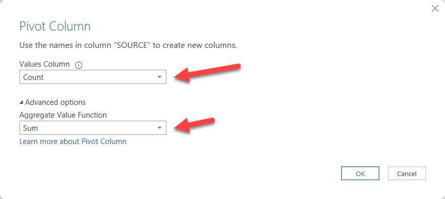And now the magic is pivoting the source column! Select the SOURCE column and go to Transform Column –> Pivot Column. Then select Count column as the column to use for the values. Sum aggregation is fine, but since we already did a group by the other fields, we could just use «Don’t aggregate» without any problem. We’ll use that option later.