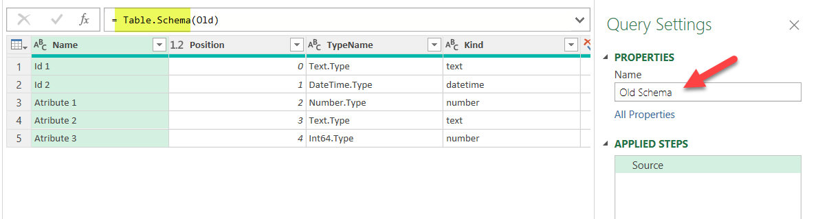 Let’s call them «Old Schema» and «New Schema». You can just modify the source step which just points to the original query, and add Table.Schema in front like