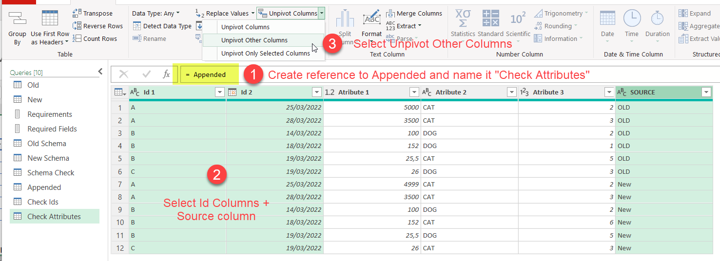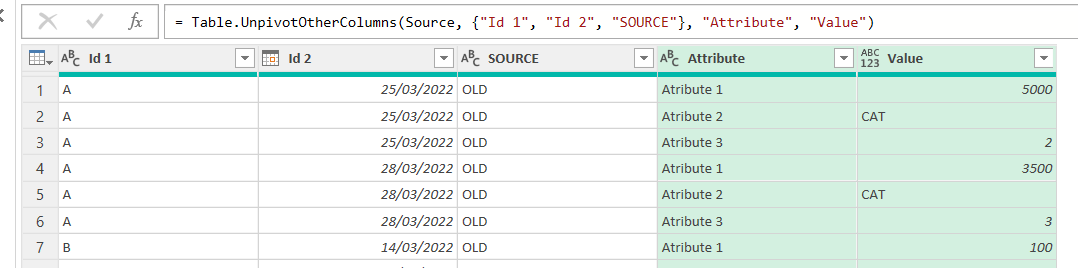 First of all (1) create a new query using Reference on the Appended query like we did when we created Check Ids query. Call this one Check Attributes or so. Now (2) select all the Id columns plus the Source column and (3) click on Transform –> Unpivot Other Columns (or like Power Query says in Spanish, «disable the dynamization of the column» <– true story)