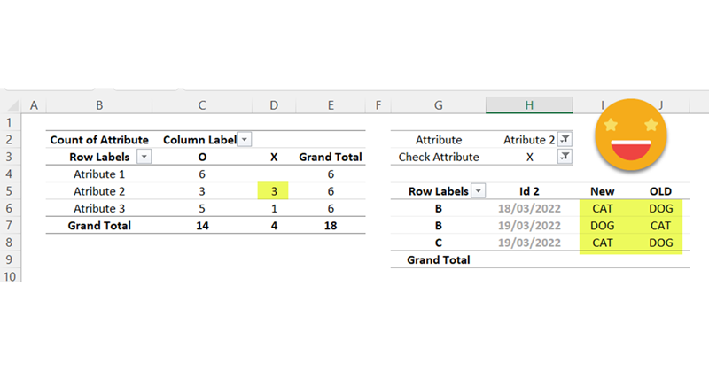 And if we load that to a pivot table it’s straignt forward to have a general view on which attributes need more attention and getting the details of the cases that do not match