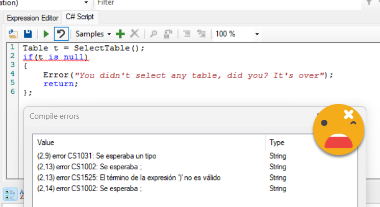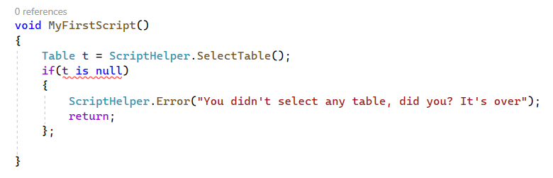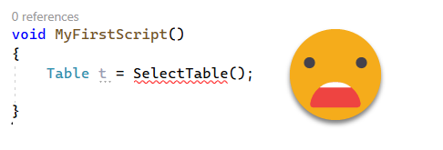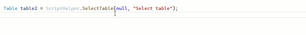 SelectTable is a function you can use in C# scripts that opens a dialog box to let the user select one table which is then returned to a variable. However if you try to use it directly, it gets an ugly red underline, what what is even worse, no intellisense!