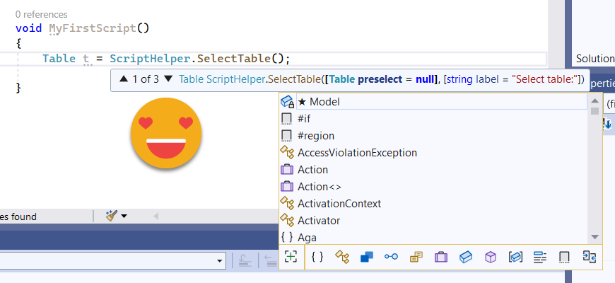 UPDATE (2022-10-29): There is only one small-ish caveat! Some of these functions have more than one «overload» that means that you can send different sets of arguments and it will do slightly different things. One of these is «SelectTable». If we only type SelectTable we only see one of the overloads, which accepts only a table to preselect it on the list and a label. However, there is another «overload» that allows you to pass a table collection as first argument, and the list will only show those tables, which is very neat. To be able to do this you will need to use the «ScriptHelper.» prefix. And then something that I learned today. With the cursor inside the parenthesis if you push CTRL + SHIFT + SPACE you can see the different overloads (these also appear right after you type the opening parenthesis).