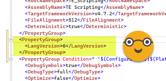 <PropertyGroup> <LangVersion>5</LangVersion> </PropertyGroup> (the image shows 6 but apparently there's little difference between the two)