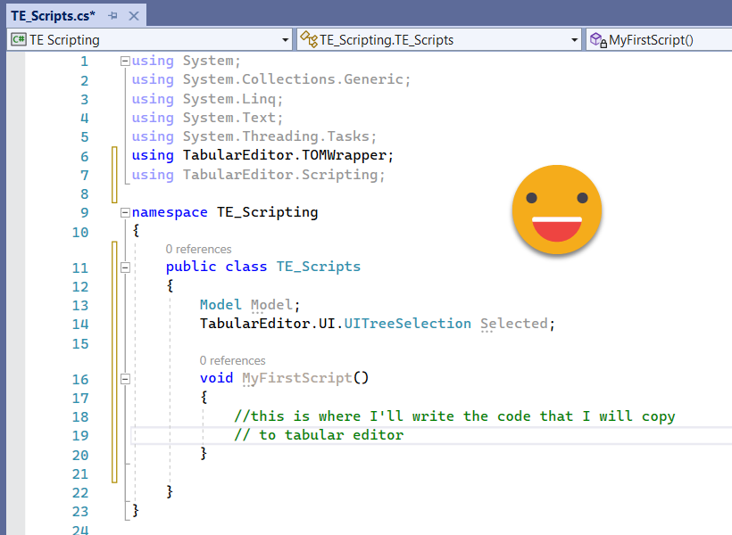 A few months back I wrote an article of what I thought would change the way I (and many more I thought) would write c# scripts from now on. In that article I explored the possiblity of creating a custom dll with all the classes and methods that would make my scripts shorter, more robust and more sophisticated all at once. The idea was cool but not quite convenient nor for development nor for distribution. However something good that came out of that is that my colleague showed me it was possible to have really good intellisense for Tabular Editor C# scripts inside Visual Studio! So even if you are not thinking about custom classes, you should definately be thinking on Visual Studio as your home for actual coding. Today I want to talk only on how to set it up so that it will not let you do anything that Tabular Editor 2 will not accept.