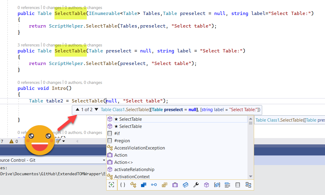 By the way I have not managed to see the different overloads in TE3. It just mentions there’s the one showing and 2 more. Morale: Keep the using TabularEditor.Scripting; line even if it says it’s not using it. You never know when you will. And if you do use it, remember to remove them!
