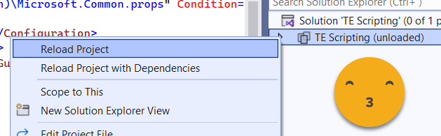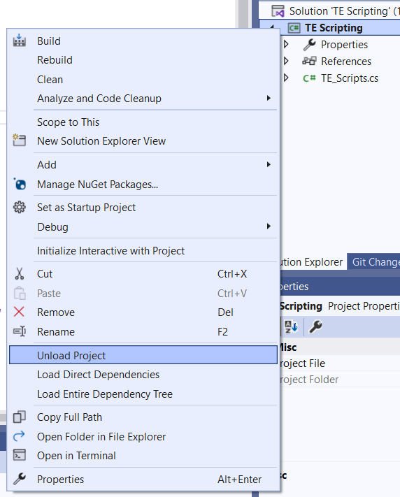 Go back to Visual Studio, save your project, right click on the project name and select unload.
