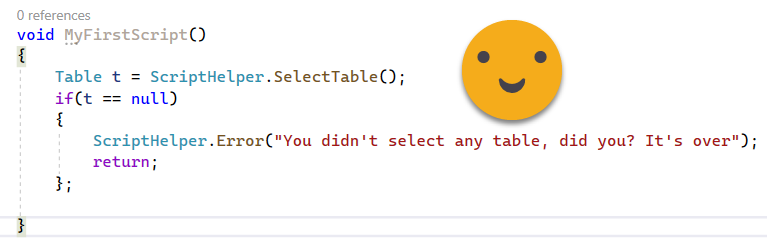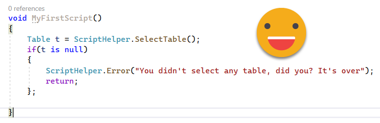 Remember to come back to your project every time you want to write some code — You can just create a new method for each script or just delete and use it as a whiteboard, your call. I find it useful to be able to quickly revisit other scripts without leaving Visual Studio. In future posts we’ll cover some strategies and tips to get user’s feedback on what is to be done or which table, column etc has to be used.