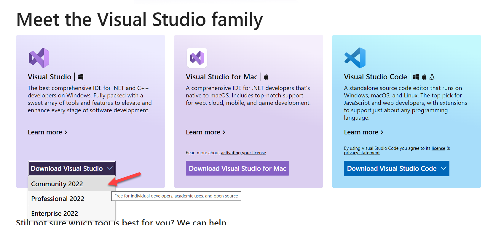 Next we will need Visual Studio. Some people tend to perfer VSCode, but I think that the aids to program are better in Visual Studio so I’ll stick with that. I may end up a section on what is different for VSCode. Go to visualstudio.microsoft.com and download the community version or higher if you have a licence for it.