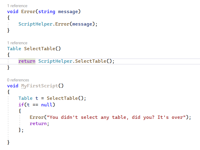 after these two we can alrelady start creating this faux methods where we can write our scripts with all luxury of intellsense and tips to write better code. Methods start with whatever they should return (or «void» if they return nothing) then the method name (upercase this time!) and then would come parameters which make no sense in our case, so just opening and closing parenthesis and then the code of the method between curly brackets. Once again, the code of the method is actually our Tabular Editor script, remember. Something like this.